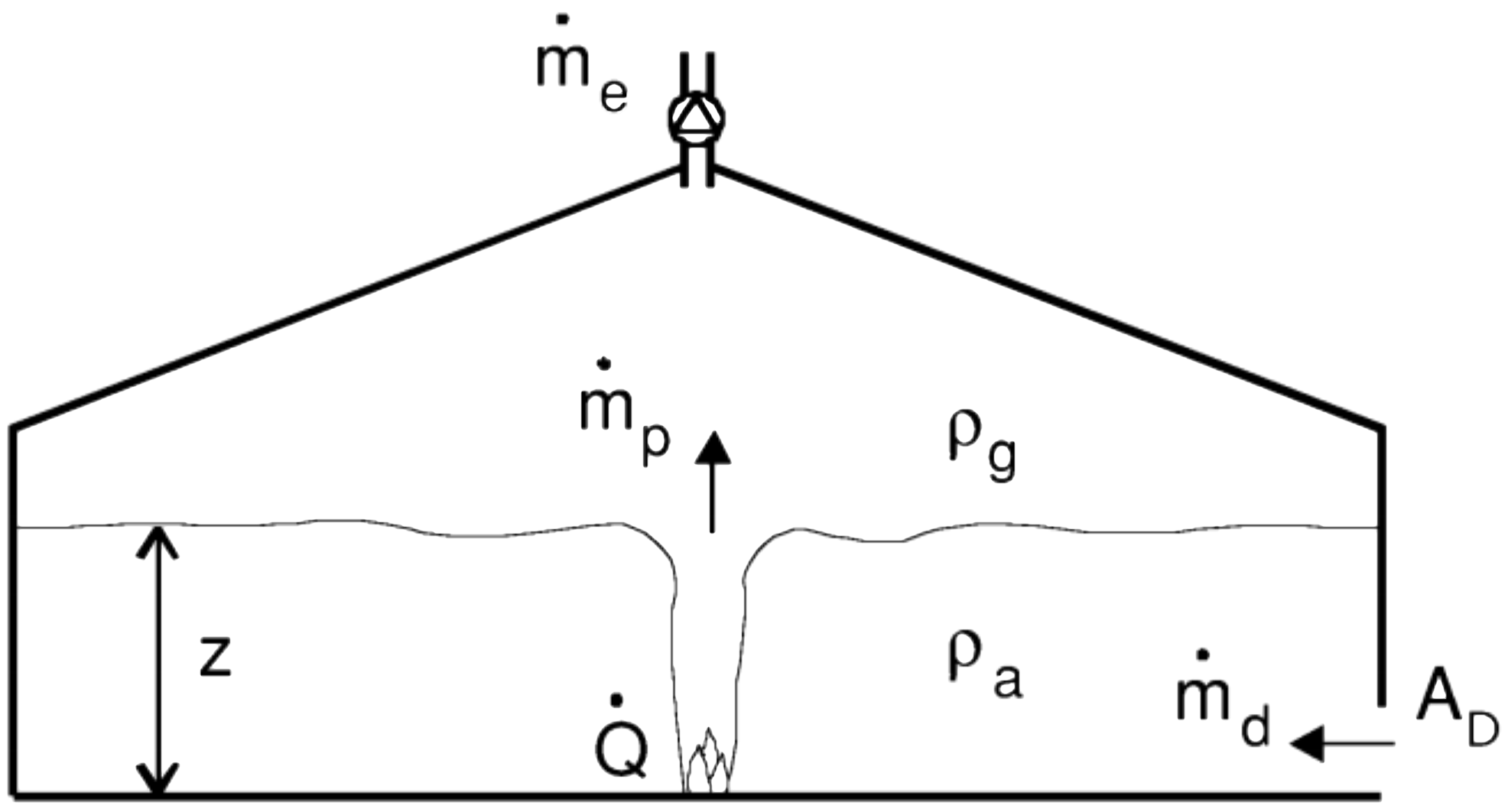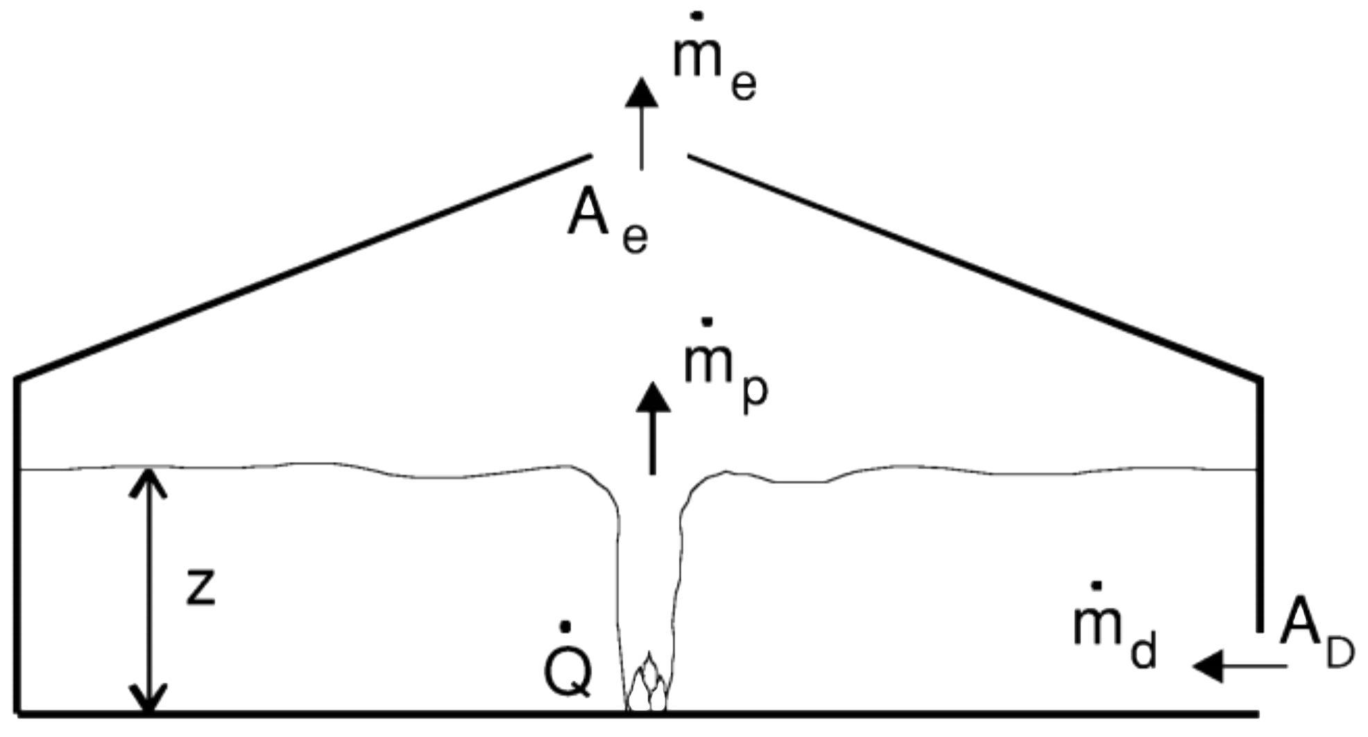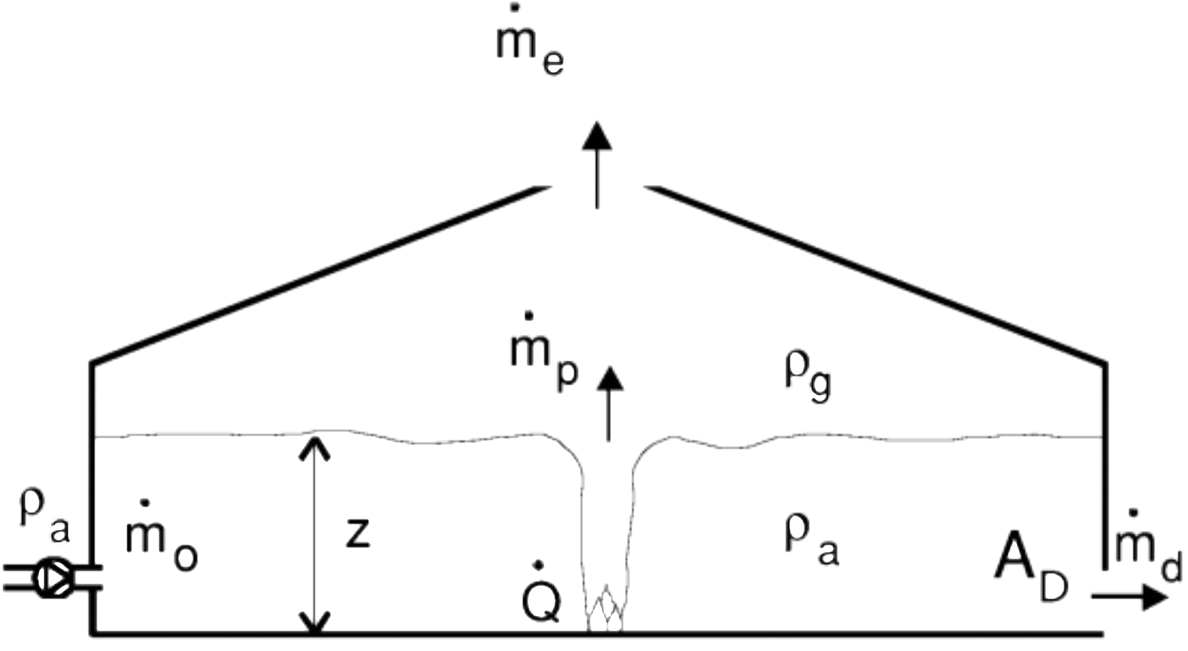Då steady-state råder är \(\dot{{m}}_{0} = \dot{{m}}_{p} + \dot{{m}}_{d} = \dot{{m}}_{e} + \dot{{m}}_{d}\)