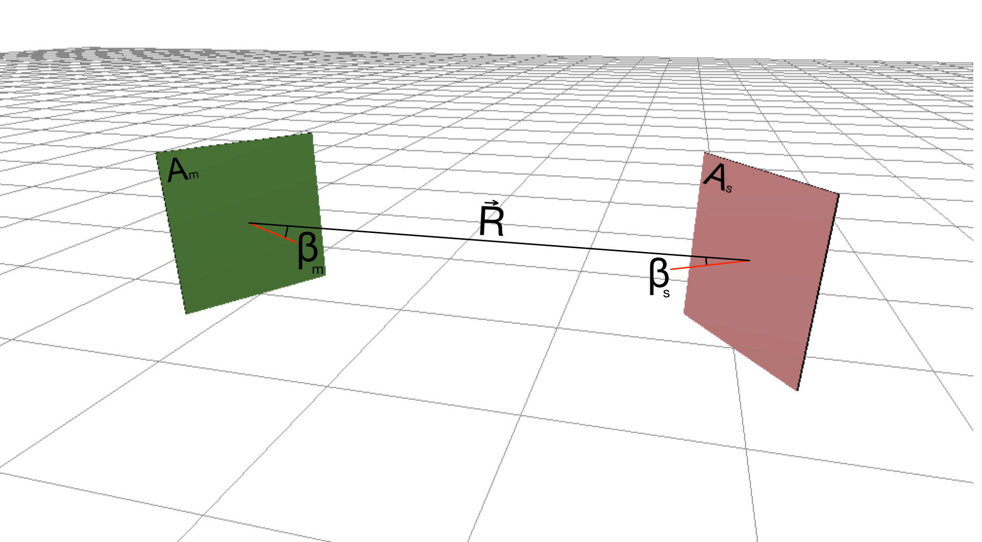 \(F_{s-m} = \large{ {cos \beta_m cos \beta_s \over \pi |\vec{{R}}|^{2} }} A_s \)